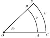 Find the area of region ACDB.  = 9cm and CD = 11cm are concentric arcs with center O.
