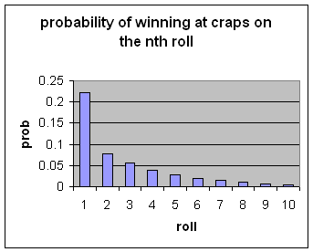 These two theoretical computation provide a good basis to test the results of simulating this process using C++ code. Simulating game play 100,000,000 times (where one play means you keep rolling until you win or lose) and counting the number of wins in a fixed number of rolls we get an empirical answer to the question by tabulating wins and losses with the length of the game. Note that the first two values are closely in line with the theoretical values.