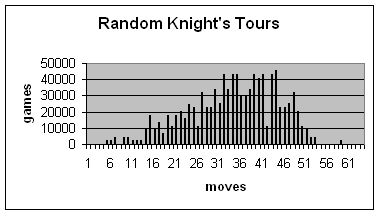 I played a million games and kept tally of how many times it lasted n moves. The results I put into an Excel spreadsheet and made a bar chart of the distribution. Here's what I got starting in a corner. I then repeated starting in the 4th row and 6th column and got the following results. These are, though it's hard to tell, actually stlightly different. What accounts for their similarity? Maybe it's something to do with the random number generator. When I allow thecomputer to pick the first position on the board, I get a significantly different result: