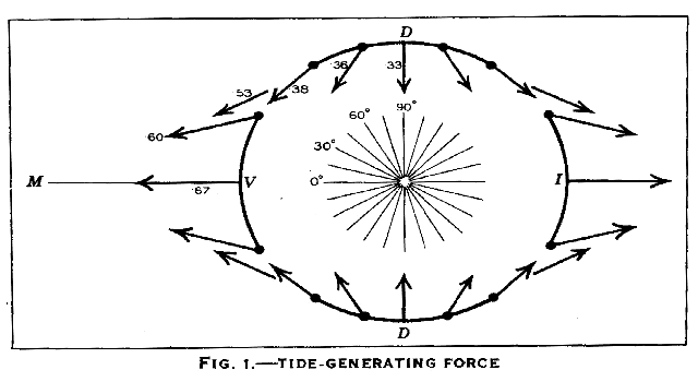 In this equilibrium form the inclination, to the horizontal, of the surface of the water would be always such that the consequential pressure gradient would everywhere balance the tide-generating force. - It is therefore clear that the surface of the water would slope upward from DD toward the points V and I, the water being raised by a maximum amount at V and I and depressed by a maximum amount along the great circle through DD. The surface of the water would be nearly that of an ellipsoid of revolution. The volume of this ellipsoid would be the same as that enclosed by the surface of the undisturbed ocean. Owing to the motion of the moon relative to the earth, the tidal ellipsoid moves over the earth so that V is always directly under the moon and I always directly opposite, while owing to the varying distance of the moon the equilibrium ellipsoid, changes slightly in shape.