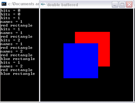 The screen capture at right shows what happens when you click outside the red and black rectangles: you get a report that you didn't hit anything (twice.) Left button clicking inside the the red rectangle leads to the report of 1 hit, which put 1 in the names buffer which then leads to the report of the red rectangle being hit (twice.) Clicking on the overlapping region (where the red rectangle is behind the blue rectangle) leads to a report of 2 hits and two ids are pushed on the names stack: uh, "1" and "2," huh? For some reason the report of a blue rectangle is always accompanied by the report of a red rectangle, even if only the blue rectangle is hit. Hmmm.