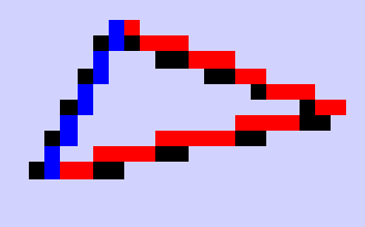 What this means is that the black pixels may or may not be overwritten by the red/blue pixels. The vertices (by happenstance) turn out to have coordinates (5,5), (23,9) and (9,14). Thus, for the first (bottom) edge, we have Δy=4 and Δx=18. The diagram is cropped so it doesn't look like it, but the big black pixel on the lower left, would have been at (5,5). Then it would have been painted red, then black again, and then...blue? Why isn't it blue? Hmmm....